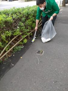 雨の日が続いたため、枯葉の散乱が目立ち、吸い殻やペットボトルもたくさん捨てられていました。今月は、ベテラン従業員に尽力いただきました。
